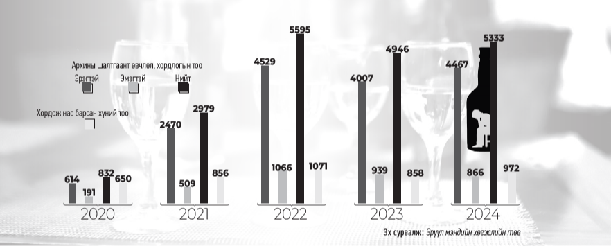 Донтох өвчтэй буюу нэгэнт архины хамааралтай амьдрах сонголт хийж, гудамжинд гарсан хүмүүсийн тухай дээр огт дурдаагүй шүү. Ахуйн хүрээний архидалт далд хэлбэрт шилжиж, жил бүр олон мянган хүн бор дарснаас болж эрүүл мэндээрээ хохирч, түүний шалтгаант өвчнөөр нас барах нь нэмэгдэж буйг Эрүүл мэндийн хөгжлийн төвийн судалгаа ч “хэлээд” өгч байна. Тус төвийнхний эмхэтгэсэн үзүүлэлтээс харахад 2020 онд 832 хүн архины шалтгаант өвчин, хордлогын улмаас яаралтай тусламж авчээ. Үүний 191 нь эмэгтэй, үлдсэн нь эрчүүд байсан аж. Тэгвэл өнгөрсөн оны байдлаар архинд хордож, эрүүл мэндийн тусламж, үйлчилгээ авсан хүний тоо 5333-т хүрсэн байна. Тэдний 4467 нь эрэгтэй, 866 нь эмэгтэй. Өөрөөр хэлбэл, дөрвөн жилийн хугацаанд архины хордлогын улмаас эмнэлэгт хандсан эмэгтэйчүүдийн тоо 4.5, эрчүүдийнх долоо дахин нэмэгджээ. Энэ бол аюулын харанга дэлдэх хэмжээний үзүүлэлт гэдгийг албаныхан хэлсэн.