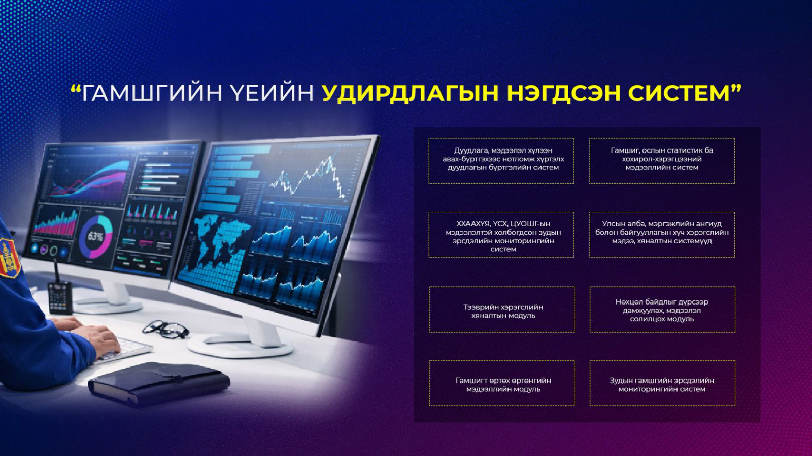 “Гамшигт өртөх өртөнгийн мэдээний модуль” гэсэн 8 модуль дэд систем хөгжүүлж, ашиглалтад нэвтрүүлээд байна.