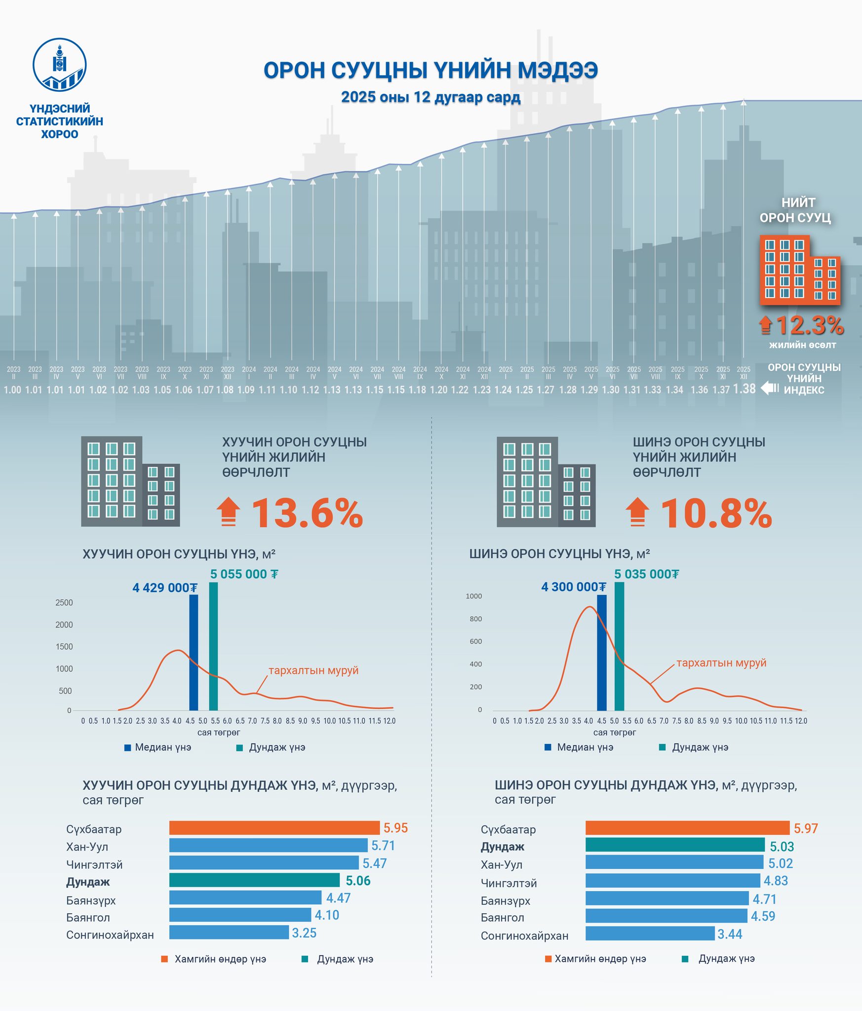 Орон сууцны үнийн индекс 2025 оны арванхоёрдугаар сард 1.38 болж, өмнөх оны мөн үеэс 12.3 хувиар, өмнөх сараас 0.8 хувиар тус тус өссөн байна. Тухайлбал, орон сууцны насжилтаар авч үзвэл, шинэ орон сууцны үнэ өмнөх оны мөн үеэс 10.8 хувиар, өмнөх сараас 1.2 хувиар, хуучин орон сууцны үнэ өмнөх оны мөн үеэс 13.6 хувиар, өмнөх сараас 0.8 хувиар тус тус өссөн байна.